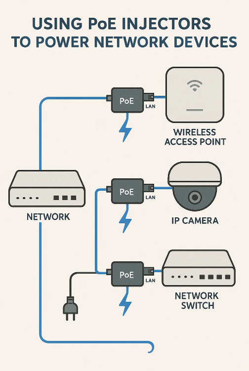 Most PoE injectors are single-port devices. That means one injector is needed for each PoE device needing power. High-quality Ethernet cables (Cat5e or Cat6/6A) are recommended to minimize power loss over longer distances and ensure reliable performance. It is important to ensure that the PoE injector provides enough power to support connected PoE devices.